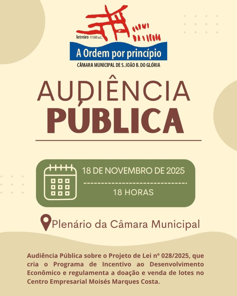 Convite para Audiência Pública a respeito do Projeto de Lei nº 028/2025, que trata da alienação e doação de lotes no Centro Empresarial Moisés Marques Costa.